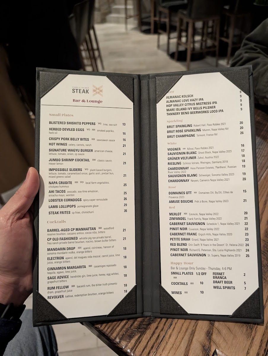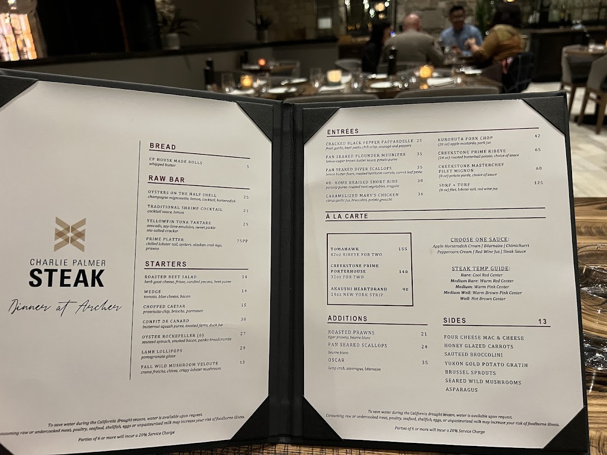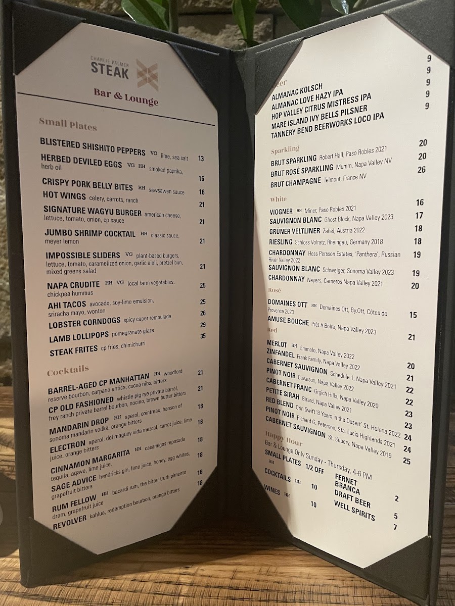 The menu at Charlie Palmer Steak Napa offers a variety of expertly prepared steakhouse fare, emphasizing high-quality meats, seafood, and classic accompaniments. It is structured to provide a range of options suitable for both focused steak dinners and well-rounded meals with appetizers, sides, and desserts.
