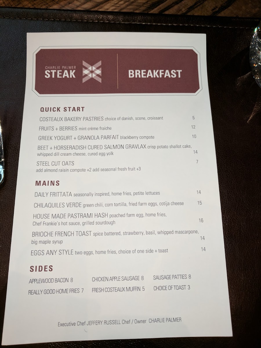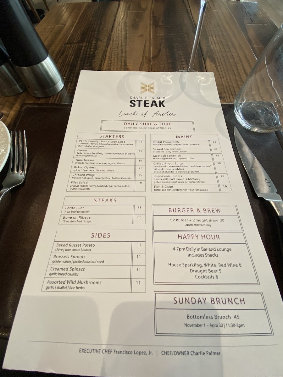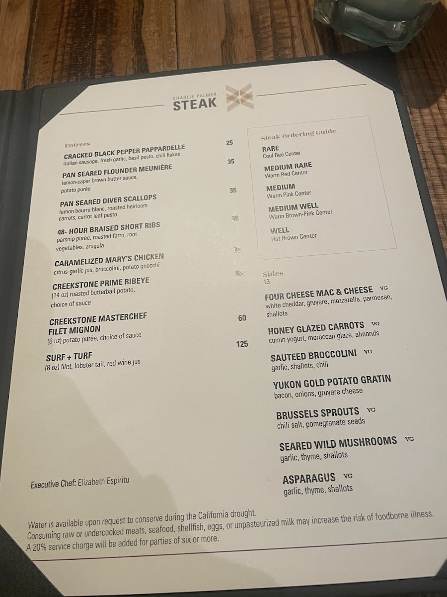 The menu at Charlie Palmer Steak Napa offers a variety of expertly prepared steakhouse fare, emphasizing high-quality meats, seafood, and classic accompaniments. It is structured to provide a range of options suitable for both focused steak dinners and well-rounded meals with appetizers, sides, and desserts.