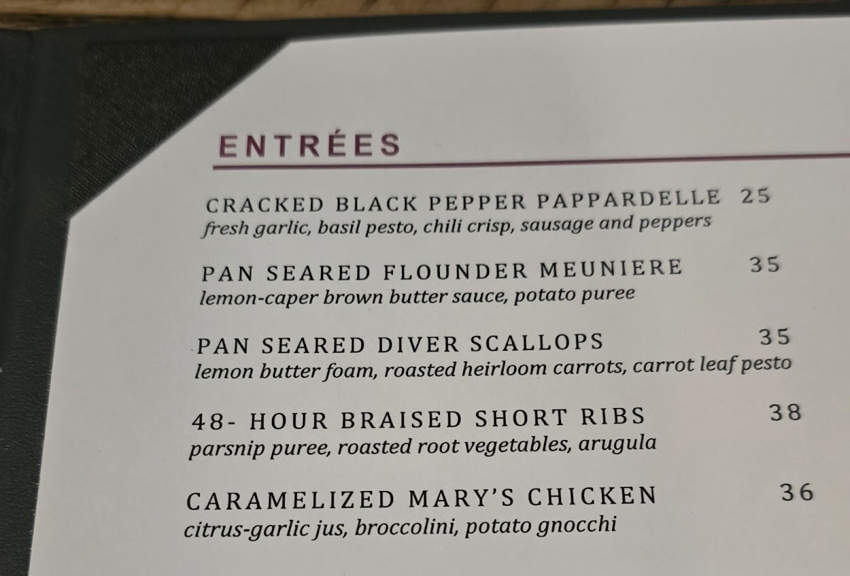 - Desserts: Sweet finishes are available with items like Butterscotch Bread Pudding with Bourbon Ice Cream and Caramel, Pecan Pie, and other desserts to conclude the meal.
