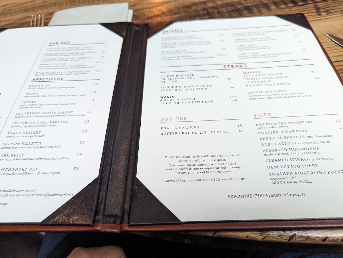 - Main Courses: Focused mainly on steak selections including Ribeye with Chimichurri, Prime Filet Mignon, Tomahawk Steak, and Pork Chop Ever. Additionally, dishes such as Duck Breast, Sea Bass, Scallops, and Seafood plates cater to varied tastes beyond beef.